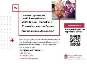 The SMPH Office of Global Health invites you to an upcoming Information Session on Field Courses available in Summer 2026 and Winter, with opportunities in Ecuador, Guatemala, Thailand, and India.